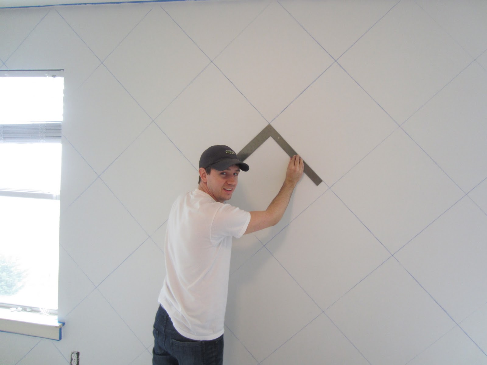 Owen's nursery is finally BLUE!  I absolutely love going into his room now because the blue color just makes it feel more "real."  My dad and Eric painted Tuesday morning while I was at work, but before they were able to paint, they spent hours taping off the accent wall where the crib will be.  See the pictures below: